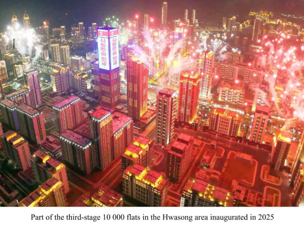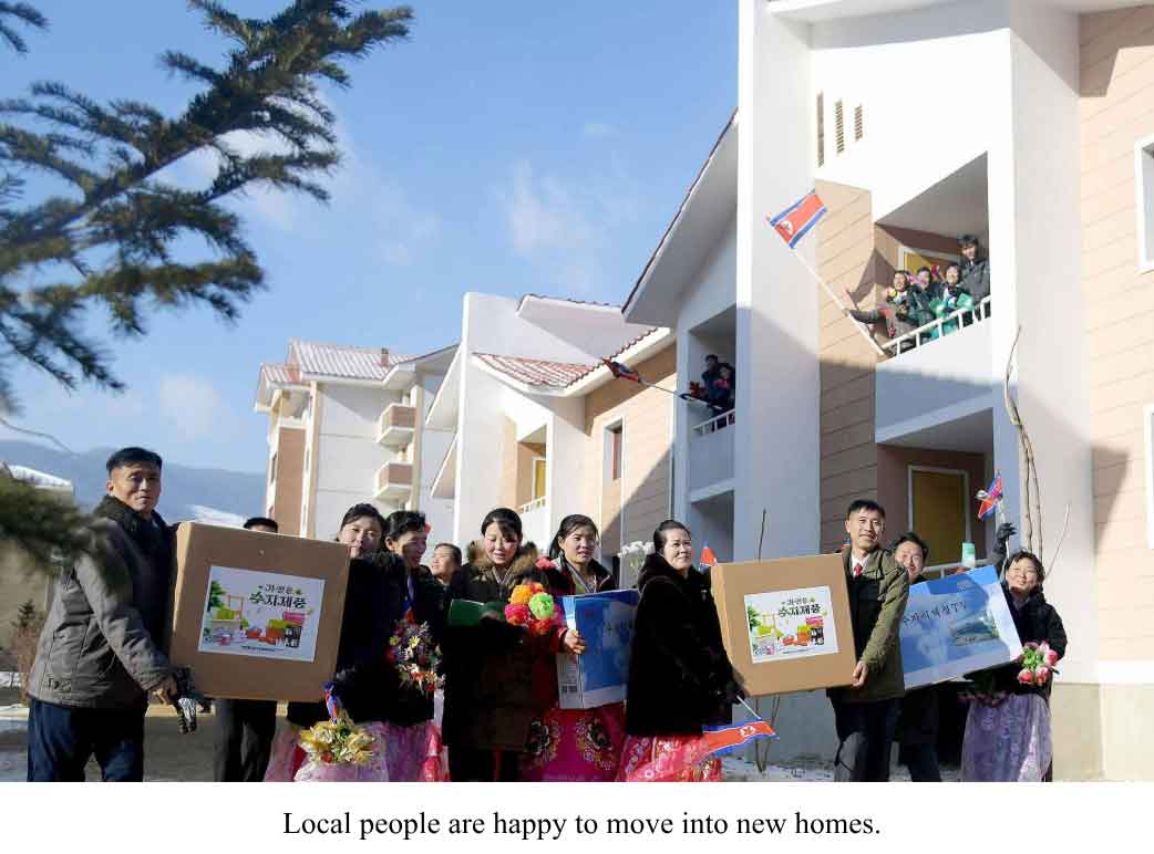 A flock of people are happy to move into new houses after the completion of the third-stage 10 000 flats construction project in the Hwasong area in April 2025.