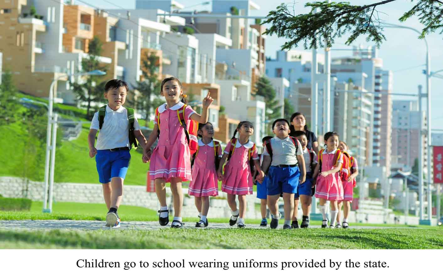 Shown here are frolicking primary school children of the DPRK. Their uniforms, bags plus school things and shoes are all supplied to them at state expense.